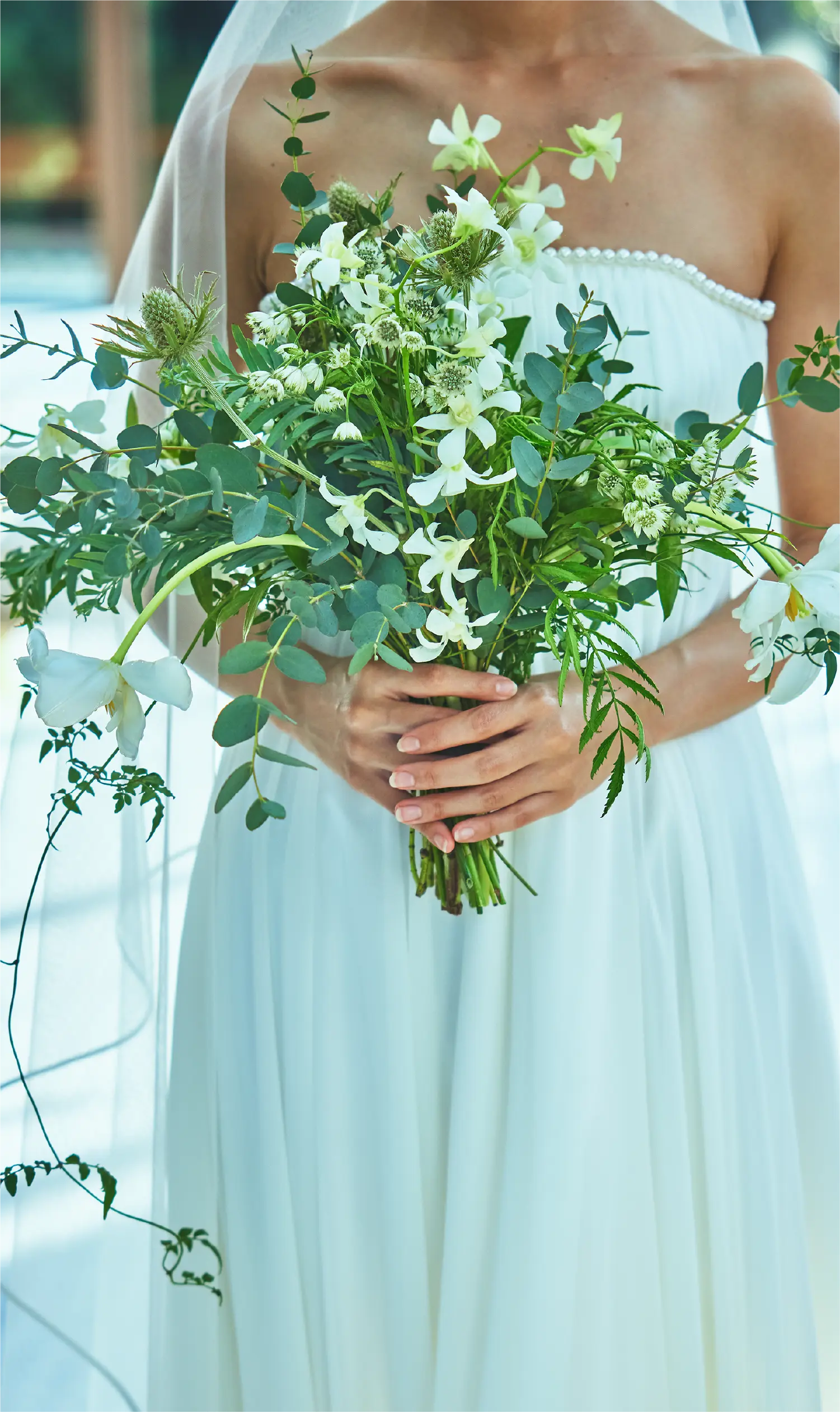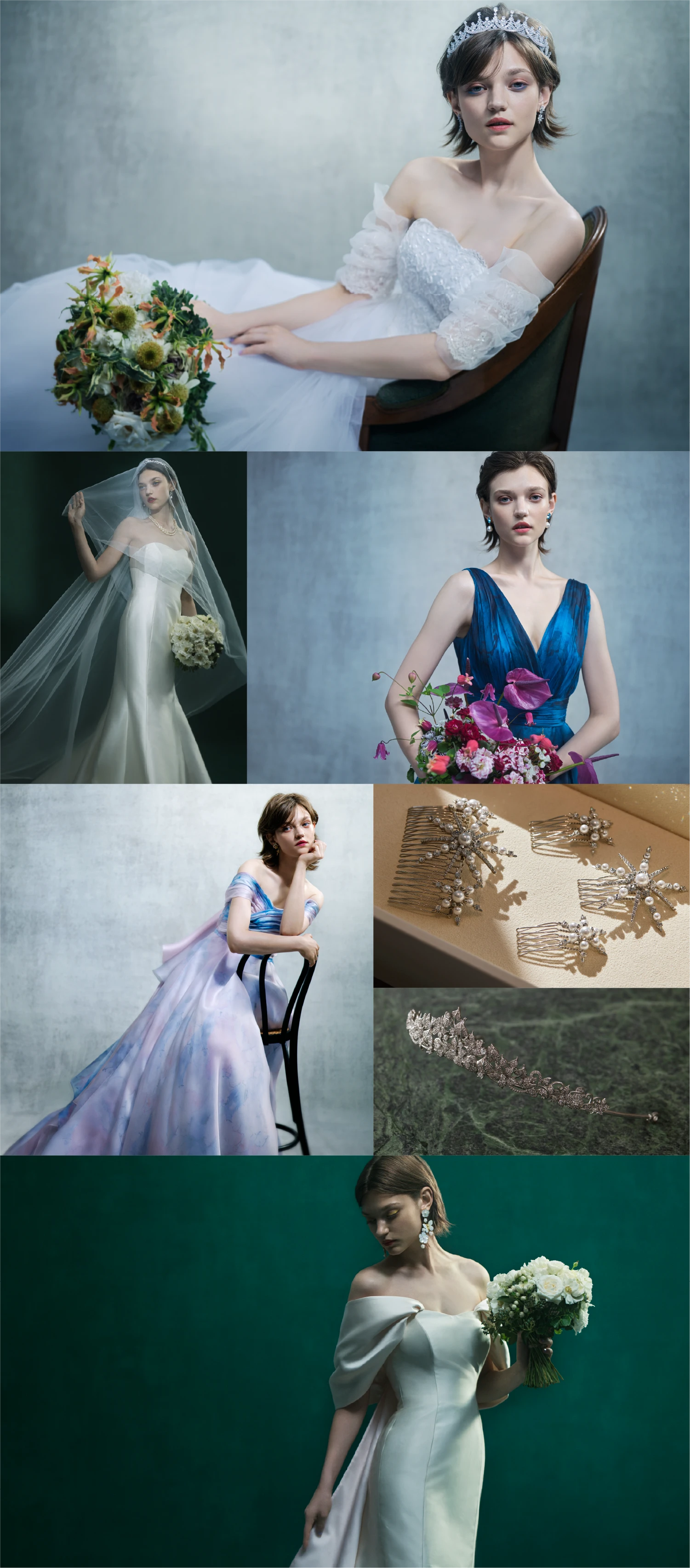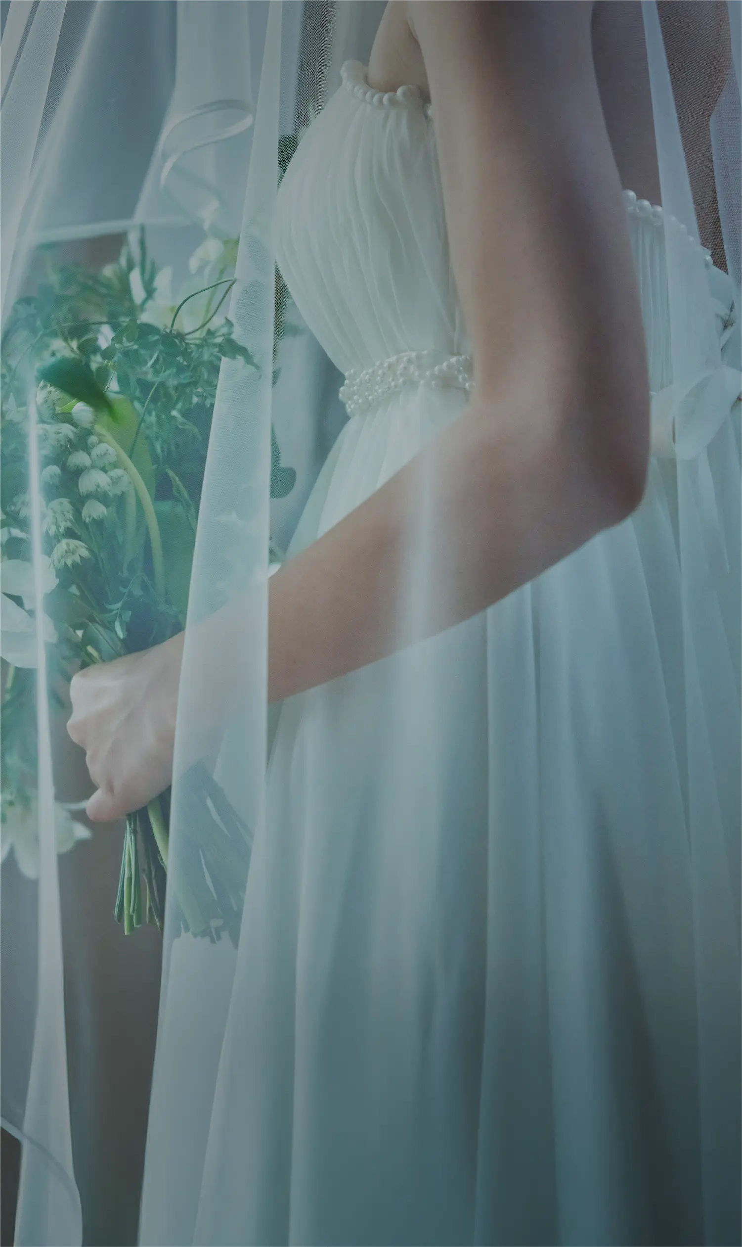 自然体のまま何色にも染まっていないからこそ、憧れの姿を自由に思いのままに。特別な一日にあなたらしい華やかさを纏っていただきたい。花嫁の憧れを叶えるトレンドのデザインやカラーを取り入れたアイテムで、幸せのコーディネートのお約束をします。
